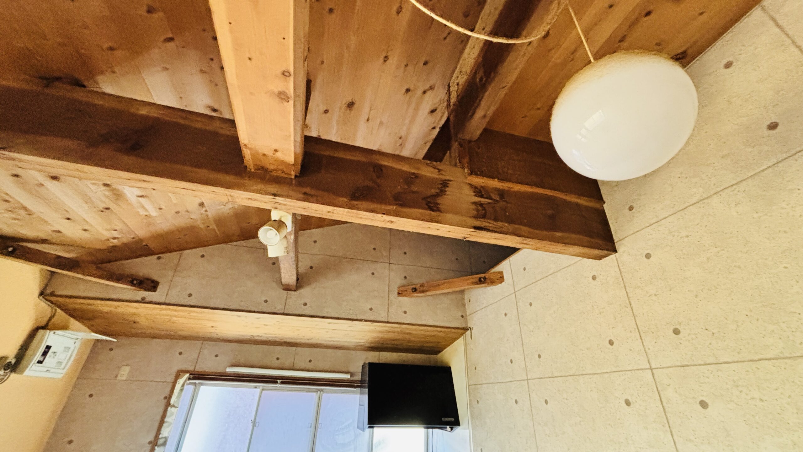 天井が吹き抜けになっていて、豪快な梁が見えてます。